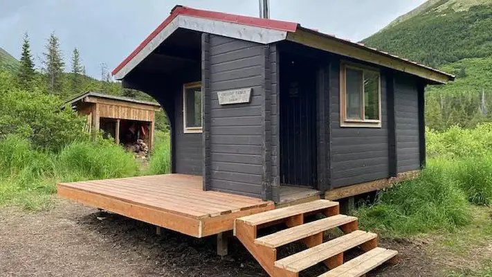 Access is by trail, 7 miles from the Carter Lake Trailhead at milepost 34 of the Seward Highway or (10.7 miles from the Crescent Creek Trailhead, from milepost 45 on Sterling Highway, take Quartz Creek road 3.2 miles to the Crescent Creek Trailhead. Cabin is also accessible by floatplane.