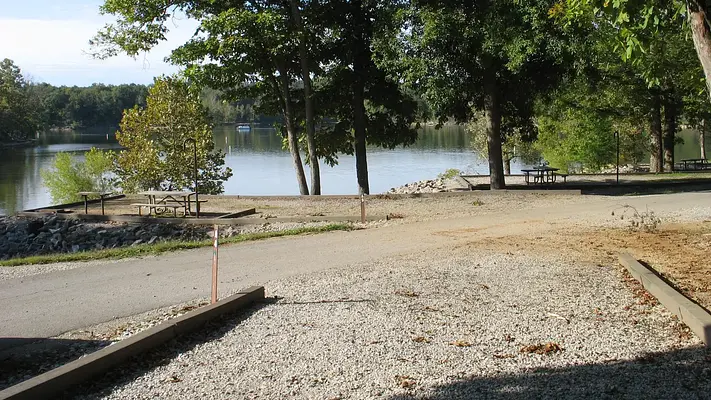 Wax Campground sits on the shores of Nolin River Lake in the rolling landscape of southern Kentucky. The large lake and surrounding greenery create a recreational oasis for outdoor enthusiasts.