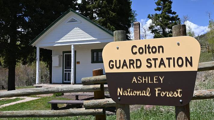 From Vernal, travel north on U.S. Highway 191/Vernal Avenue for approximately 20 miles. Turn left (west) on Forest Road 020. A paved parking lot with a restroom is located at the intersection. Continue northwest on the paved Forest Road 020 for approximately two miles. Turn left (southwest) at Forest Road 019 and continue for less than a mile, reaching an intersection (Forest roads 028 and 019). Turn left, continuing south on Forest Road 019. Continue approximately 1.75 miles, where the road turns sharply to the right (west). Follow the hairpin turn down into a ravine to Colton Guard Station.
